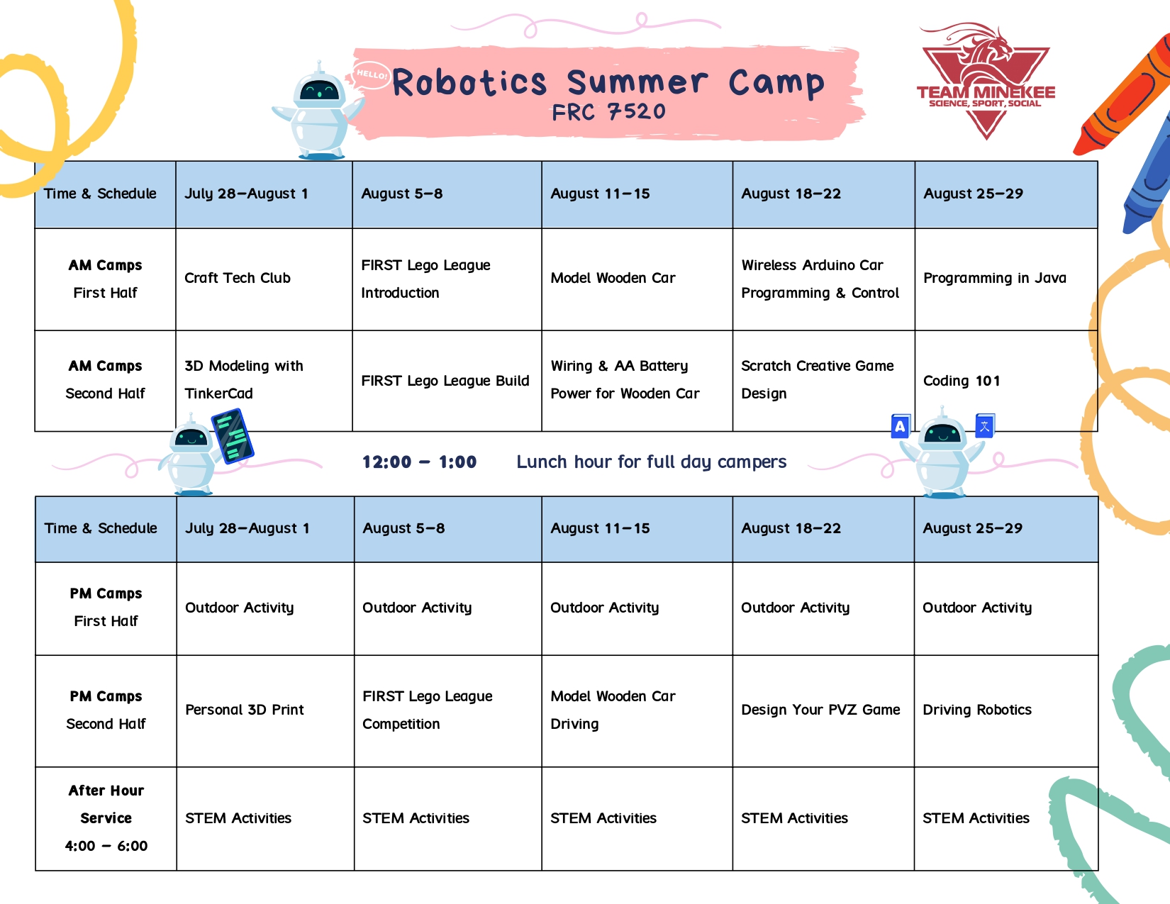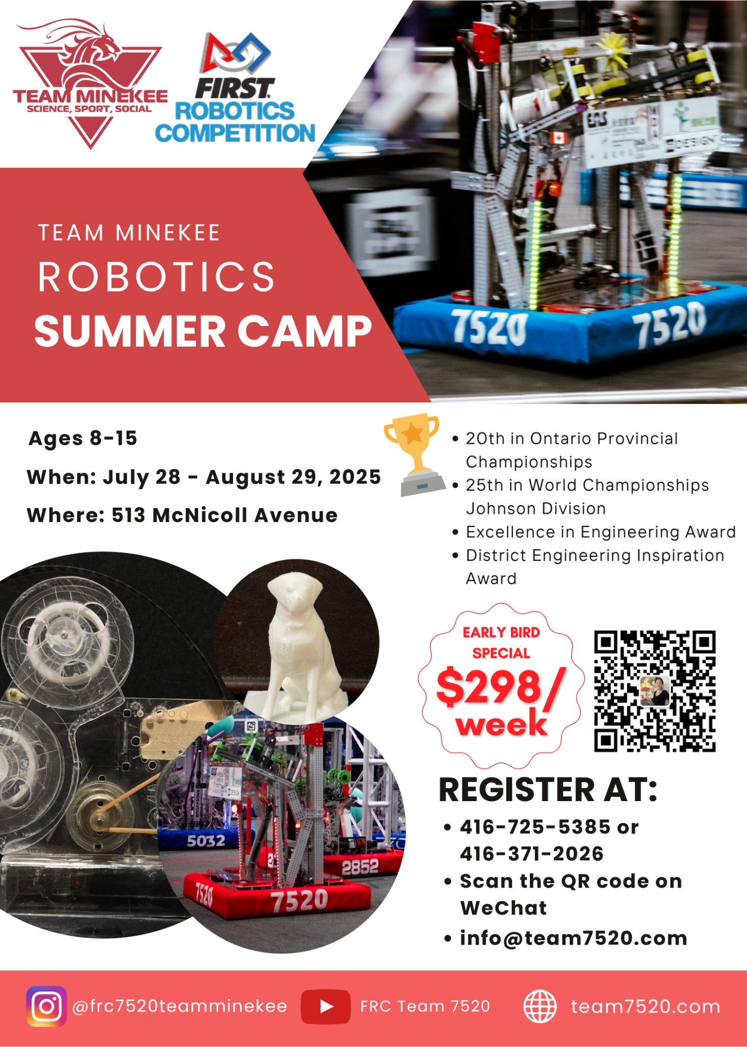 Team 7520 will be having a robotics summer camp this summer for kids aged 10-14. Students will learn about programming and robot building. See the information below for more details.